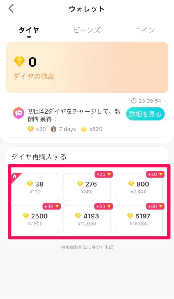 それぞれ3種類の支払い方法では、一度に購入するダイヤの数と価格が設定されています。
