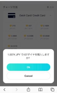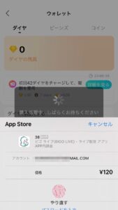 この画面から、購入金額を支払うとウォレットに購入分のダイヤがチャージされます。