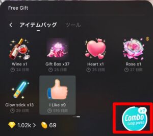 LIKEのギフトを1つのみ送信すると「COMBO」と表示が変わります。