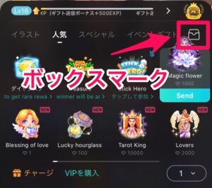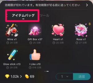 有料のギフトが一覧で表示されるが、右上のボックスマークをタップするとアイテムバックが開きます。