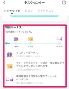 3日間・7日間・15日間で連続でチェックインするともらえる特別なボーナスです。